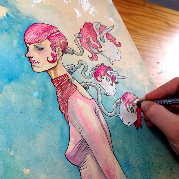 I feel like #WuTang might be a odd soundtrack for inking #unicorns. #CoffeeCreatures #Kickstarter #Copic #Watercolor #illustration